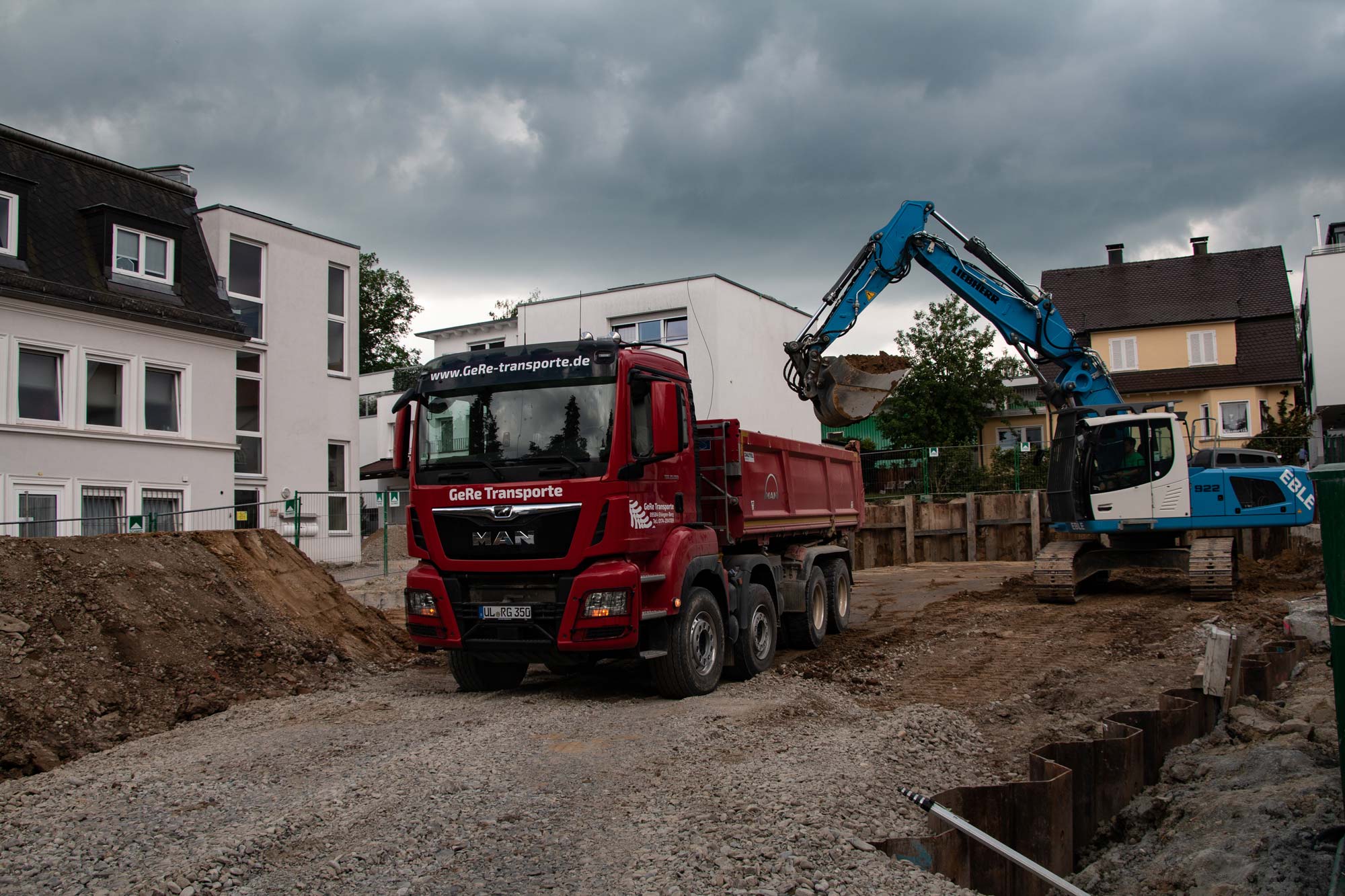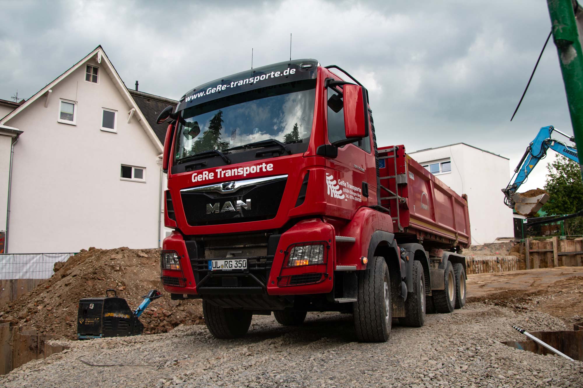 Durch den Einsatz eines Vierachs-LKWs sind wir auch im Straßentransport schlagkräftig. Mit einer Nutzlast von 18t können wir Schüttgüter wie Sand, Erdaushub, Kies usw. für Sie transportieren.