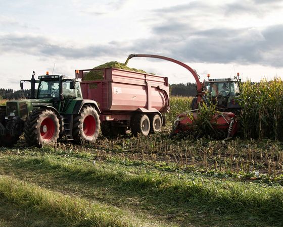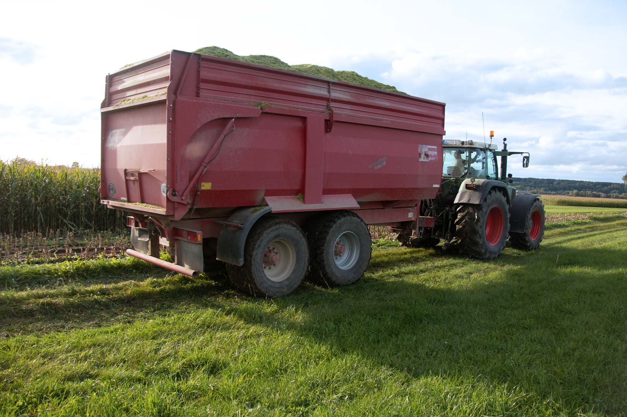 Unseren Pöttinger Jumbo 10010 setzen wir auch im Transport ein. Dabei profitieren wir vom 3-Achsigen Fahrwerk mit großvolumiger Bereifung. Die Ladekapazität beträgt 50 Kubik.
